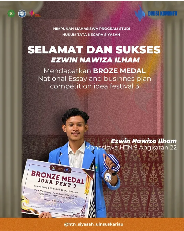 Mahasiswa Jurusan Hukum Tata Negara (HTN) kembali menorehkan prestasi membanggakan. Ezwin Nawiza Ilham, mahasiswa Angkatan 2022, berhasil meraih Bronze Medal dalam ajang National Essay and Business Plan Competition pada Idea Festival 3.