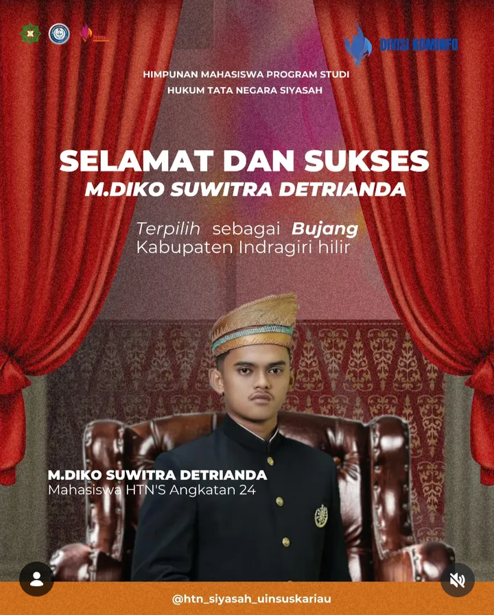 Mahasiswa Jurusan Hukum Tata Negara (HTN) kembali menorehkan prestasi membanggakan. M. Diko Suwitra Detrianda, mahasiswa Angkatan 2024, berhasil terpilih sebagai Bujang Kabupaten Indragiri Hilir.