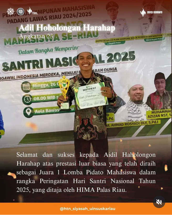 Mahasiswa Jurusan Hukum Tata Negara (HTN) kembali menorehkan prestasi membanggakan. Aidil Haholongon Harahap berhasil meraih Juara 1 Lomba Pidato Mahasiswa dalam rangka Peringatan Hari Santri Nasional Tahun 2025.