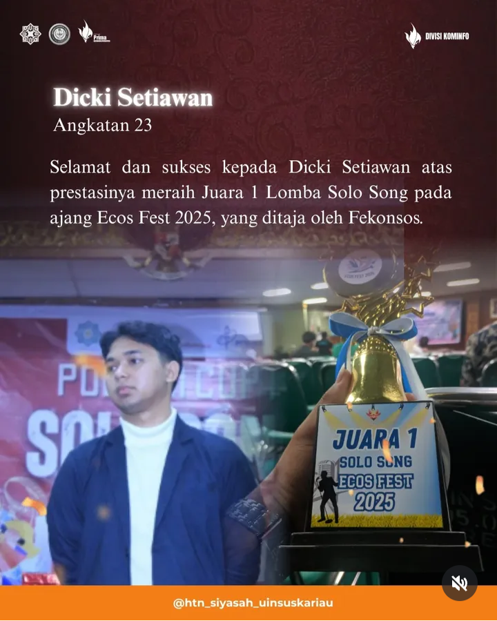 Mahasiswa Jurusan Hukum Tata Negara (HTN) kembali mengukir prestasi membanggakan. Dicki Setiawan, mahasiswa Angkatan 2023, berhasil meraih Juara 1 Lomba Solo Song pada ajang Ecos Fest 2025 yang diselenggarakan oleh Fekonsos.