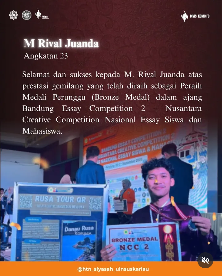 Mahasiswa Jurusan Hukum Tata Negara (HTN) kembali menorehkan prestasi membanggakan. M. Rival Juanda, mahasiswa Angkatan 2023, berhasil meraih Medali Perunggu (Bronze Medal) dalam ajang Bandung Essay Competition 2 yang diselenggarakan oleh Nusantara Creative Competition tingkat nasional untuk kategori esai siswa dan mahasiswa.